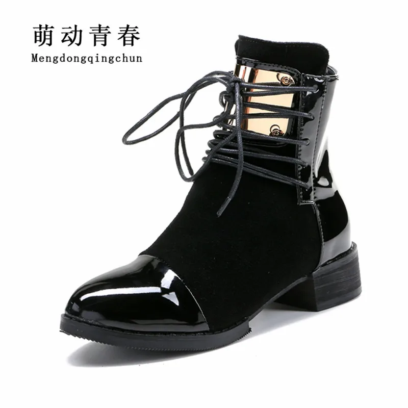 35-43 Women Boots Genuine Leather Flat Martin Ankle Boots Womens Motorcycle Boots Autumn Shoes Women Winter Patent leather Botas Recommend